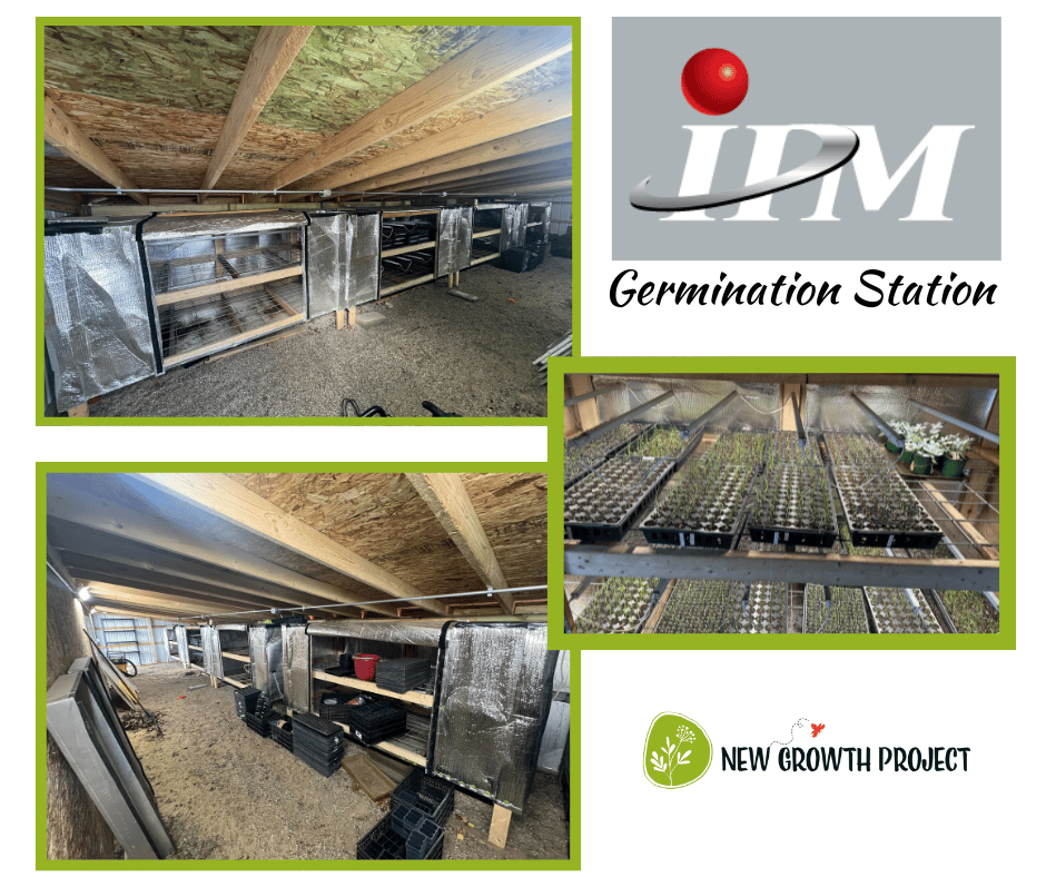We are so grateful for our community partners. A few years ago, a collaboration with Integrated Packaging Machinery helped us rehab a part of our collapsed greenhouse. We rebuilt this section with a gift from IPM and built several new germination stations. As the employees fill trays with seeds, they are kept in these stations at the correct temperature, with light and air movement, to create the best environment for growing seedlings.